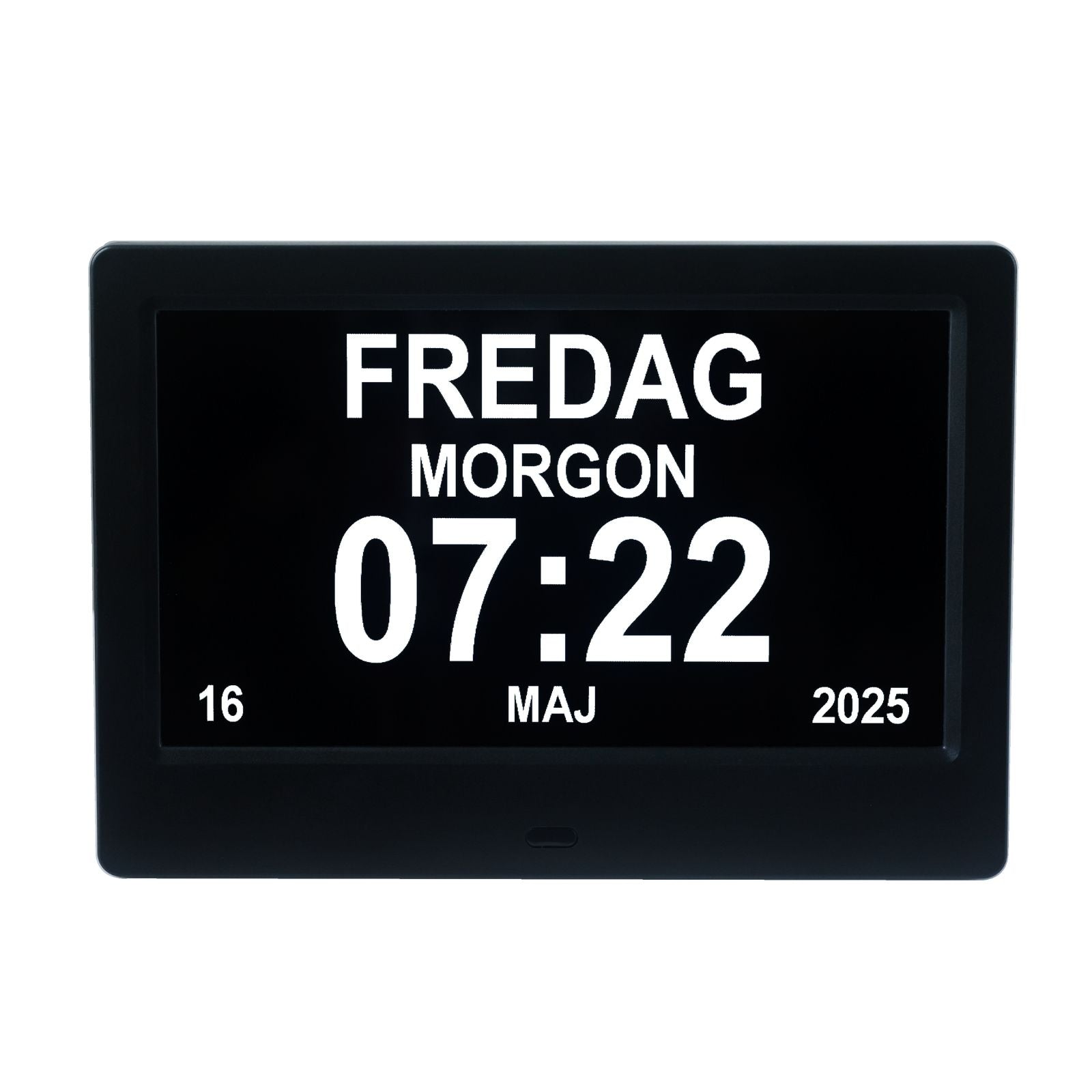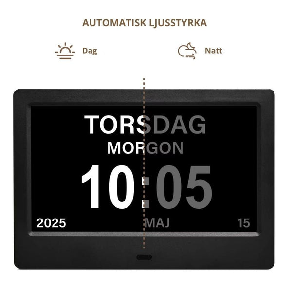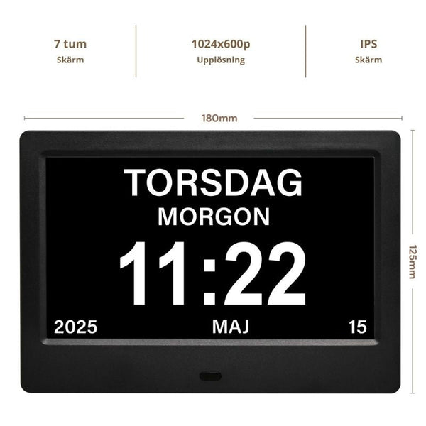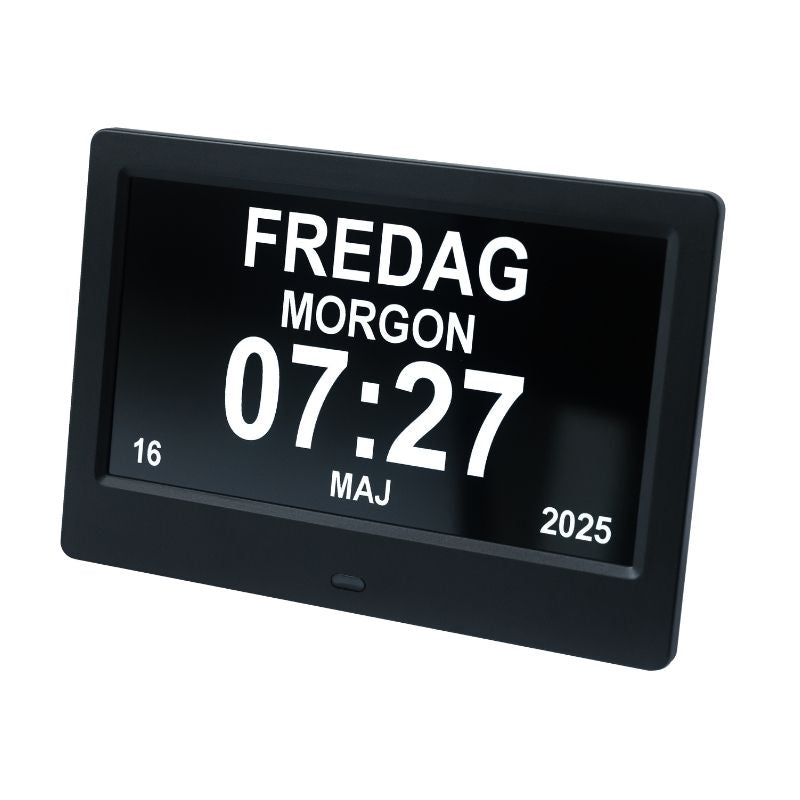 Den visar det allra viktigaste - tid, veckodag, datum och del av dygnet (morgon, förmiddag, eftermiddag, kväll och natt). Allt i ett tydligt och enkelt format som är lätt att läsa.